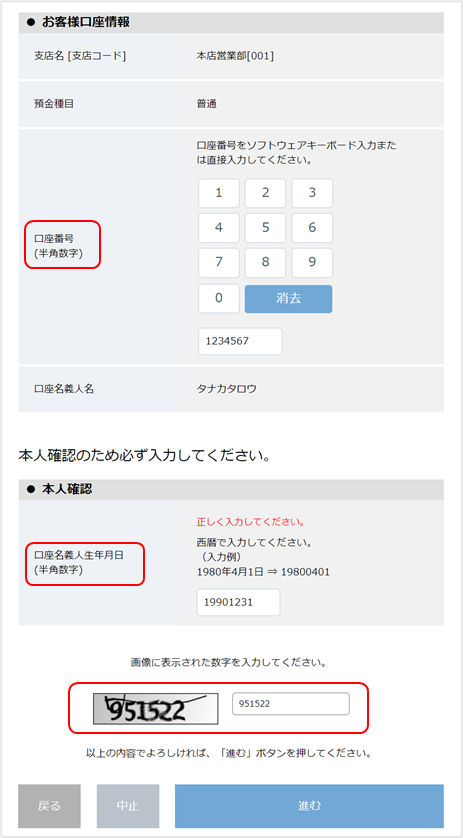 - 銀行によっては、「電話番号」や「キャッシュカード暗証番号」「口座残高下4桁」の入力を求められるケースがあります