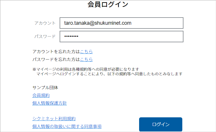 ②管理者から案内された「アカウント」「パスワード」を入力し、「ログイン」をクリックします。
