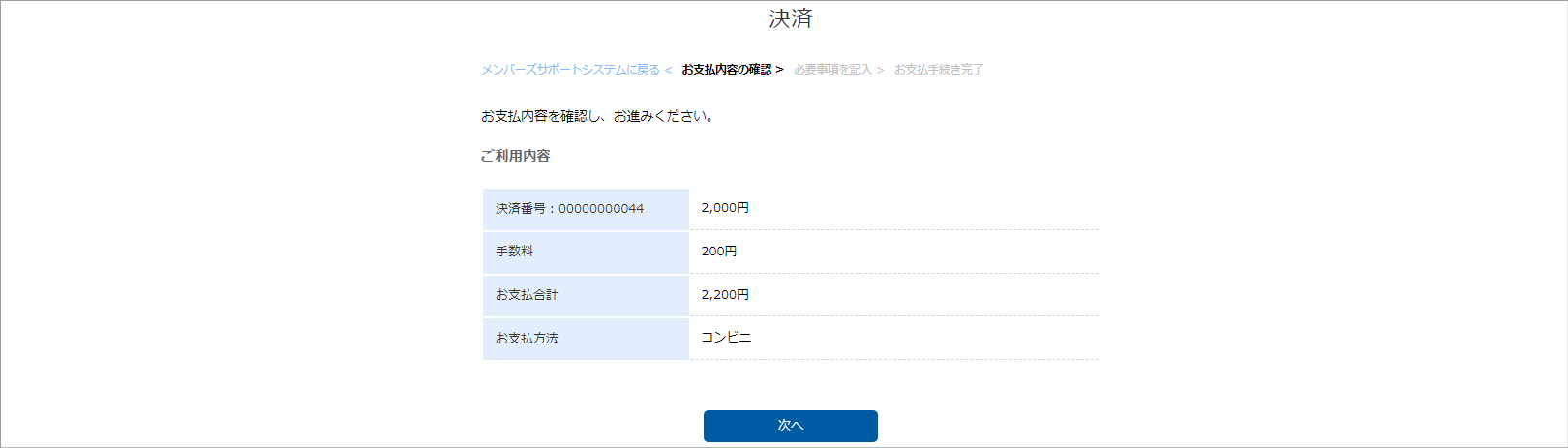 ③お支払い内容を確認し、「次へ」をクリックします。